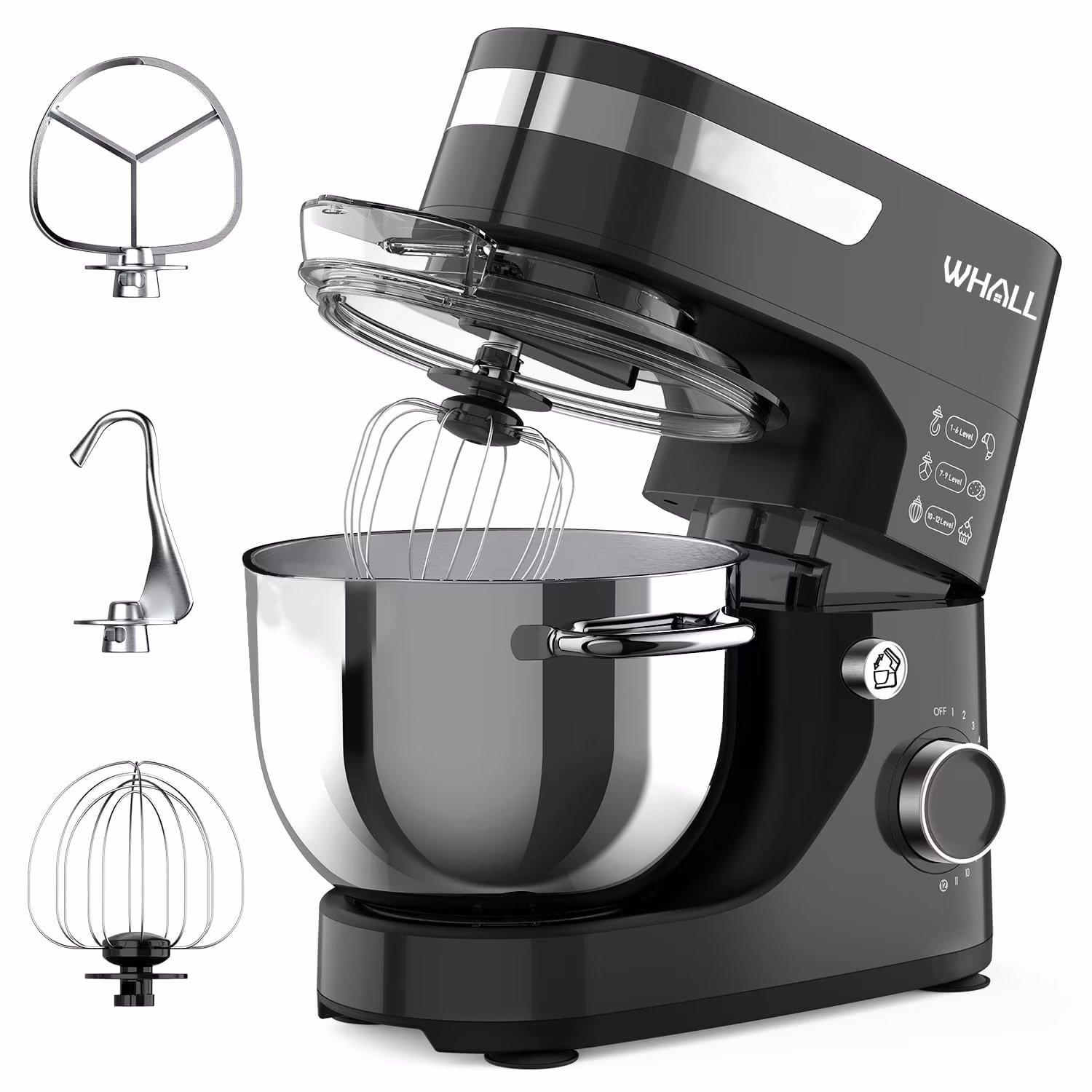 WHALL Stand Mixer - 5.5Qt 12-Speed Tilt-Head Electric Kitchen Mixer with Dough Hook/Wire Whip/Beater, Stainless Steel Bowl (Black) New